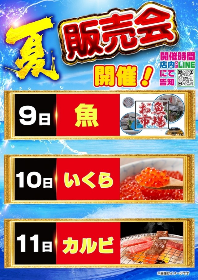 2025/08/08明日から3日間販売会開催‼️明日 8月9日 さかな販売会開催!! 開催時間は16時から!   皆様のご来店をスタッフ一同 心よりお待ちしております。