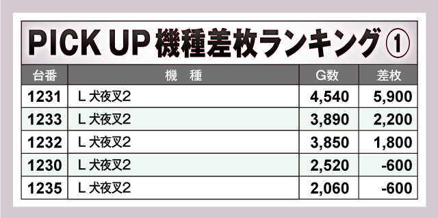 続いては、当日とくに盛り上がっていた3機種を紹介。3機種とも好記録がてんこ盛りで、それらのなかでも「L 犬夜叉2」は、ピックアップ5台のうち3台が差枚+1,000枚オーバーと素晴らしい結果をマーク! もちろんその他2機種を含め、店内全体が活気に溢れていた!