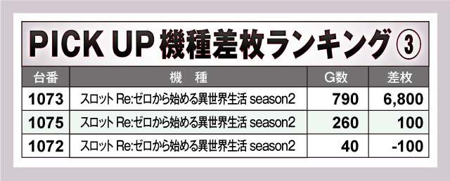 まずは差枚ランキング30台のチェックから。30台のうち24台が+1,000枚オーバーを記録し、+3,000枚オーバーは13台出現! それらのなかでもっとも優秀だったのは、1507番台の「チバリヨ2」で、差枚は大台突破の+12,600枚と素晴らしい記録をマーク! その他ランクイン機種には、人気スマスロ機種や最新機種、ジャグラーシリーズなど店内のあらゆる機種にチャンスがあったようだ!