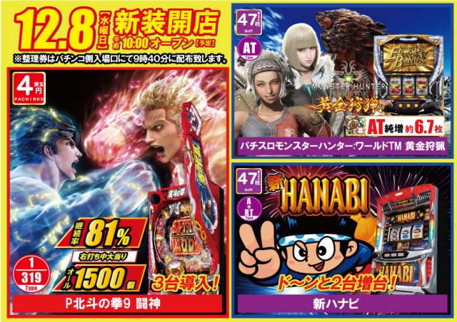 本日新装開店!北斗の拳9、Sモンハン、新ハナビなど!