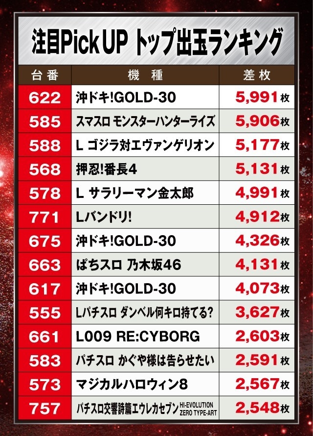 また、その他の機種では『スマスロ モンスターハンターライズ』と『L ゴジラ対エヴァンゲリオン』、『押忍!番長4』の+5,000枚超をはじめ、ありとあらゆる機種で+4,000枚超が出現。広範囲に渡ってチャンスが潜んでいたのは間違いないだろう。