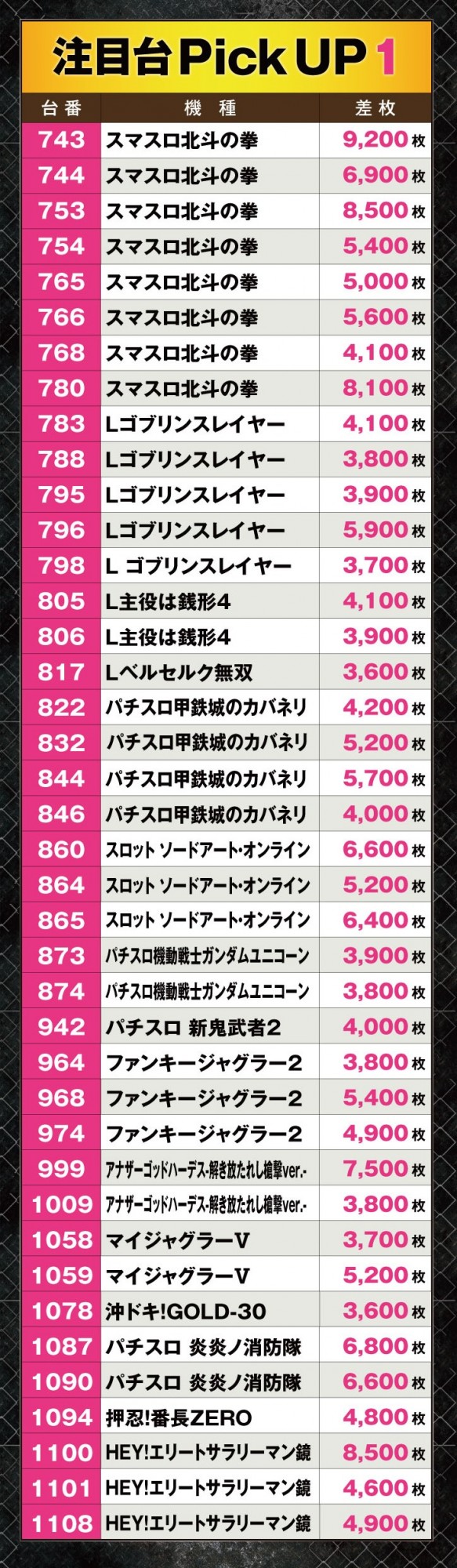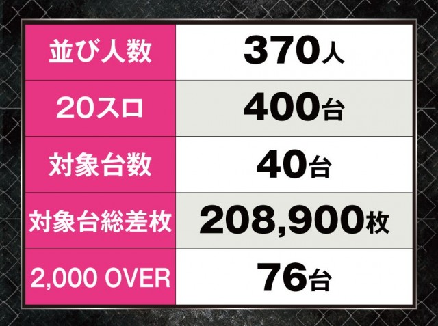 店内では人気機種を筆頭に至る所から好調台が確認できる結果となった。次回開催時にはこれらを参考に、是非チャンスを掴んで欲しい。