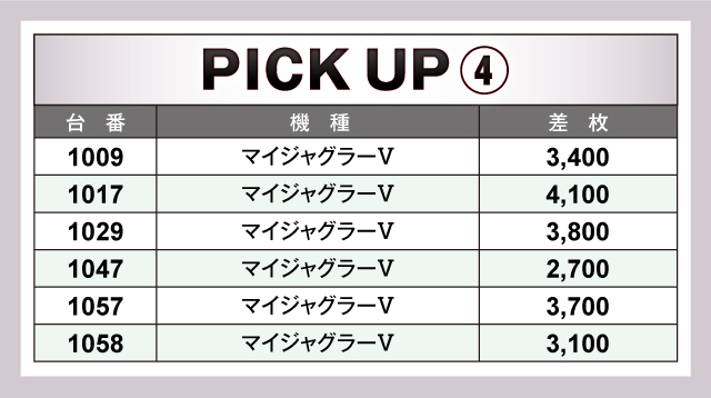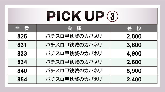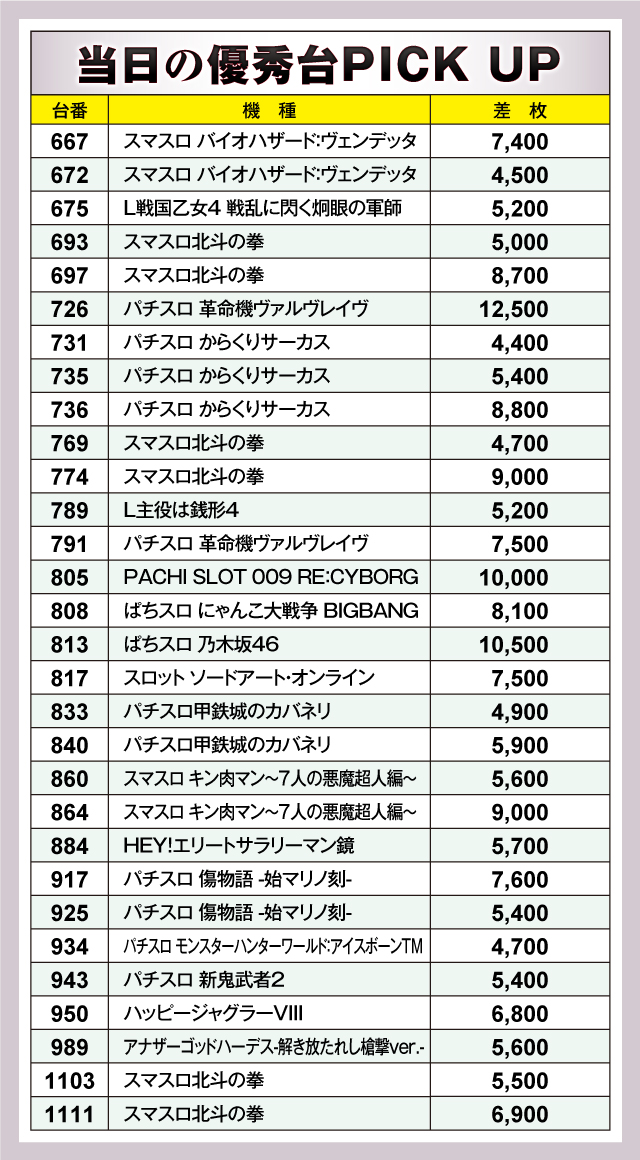 ピックアップは4か所。さきほどの優秀台のラインナップではわからなかったが、人気機種にもしっかりと差枚数がプラスになっている台が出ている。『北斗』『カバネリ』『マイジャグ』の各種優秀台はこのようになっているのでチェックしておこう。