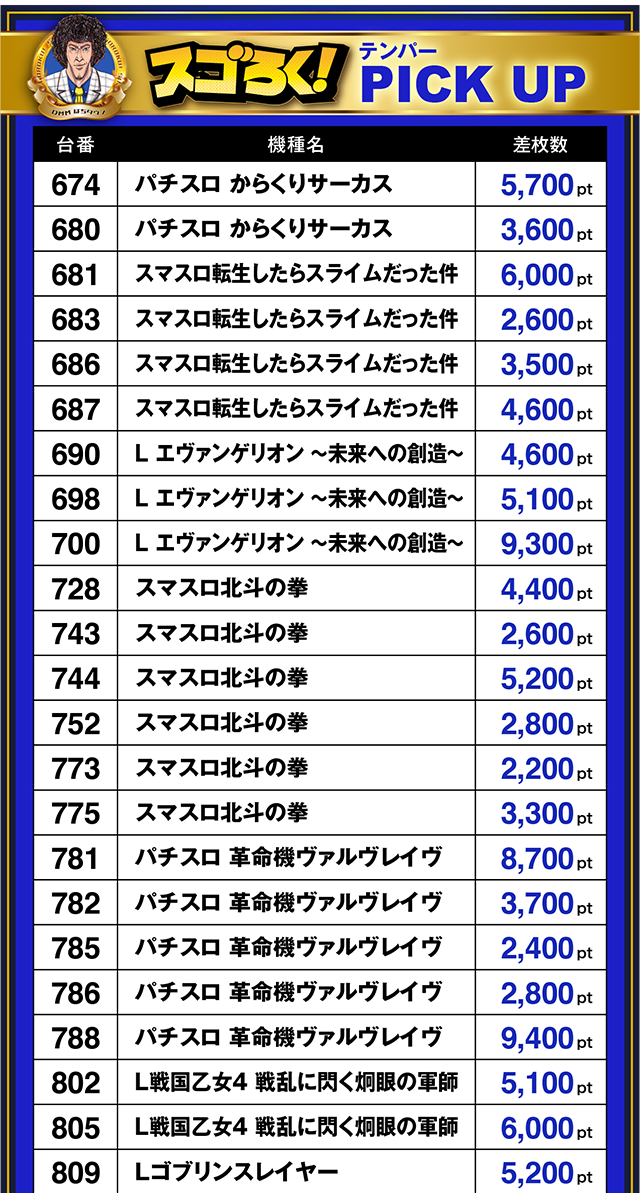 「パチスロ 革命機ヴァルヴレイヴ」にもナイスな台が多く、9,000pt以上や8,000pt以上の台を発見!