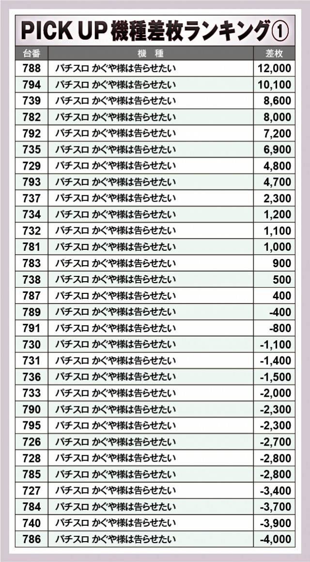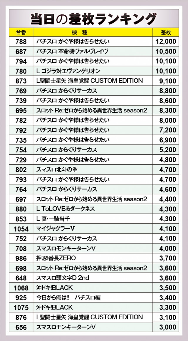 ※差枚数順に掲載しています。