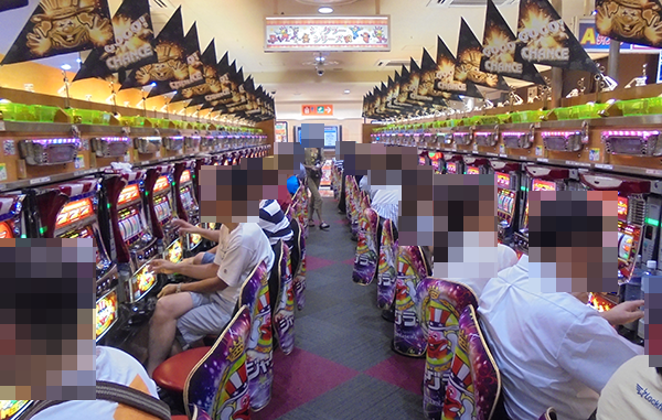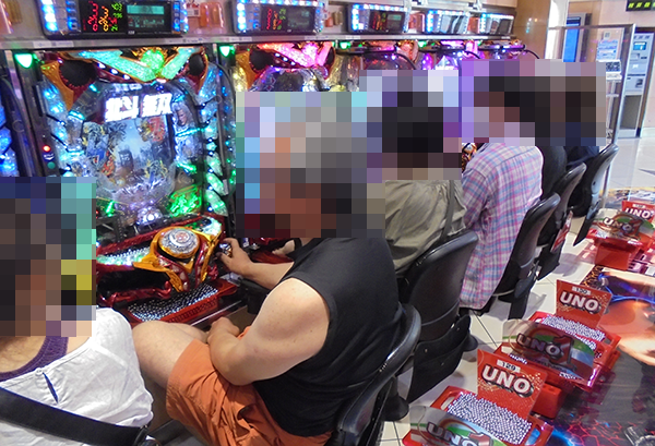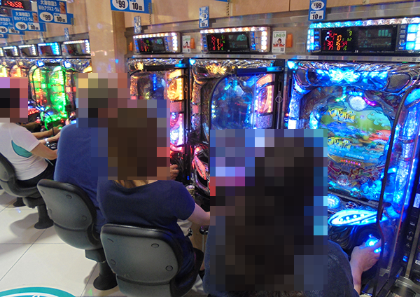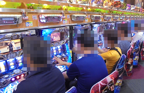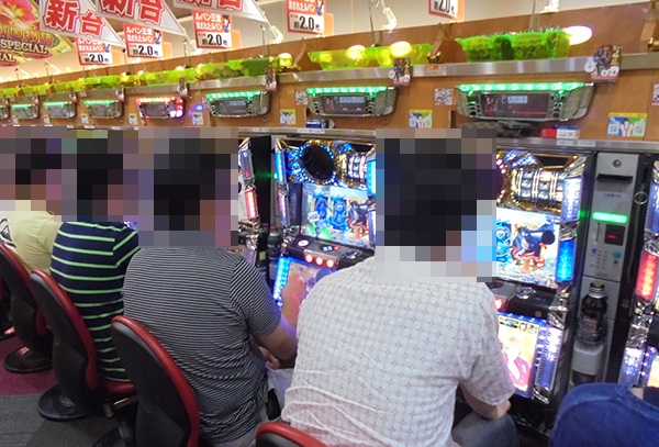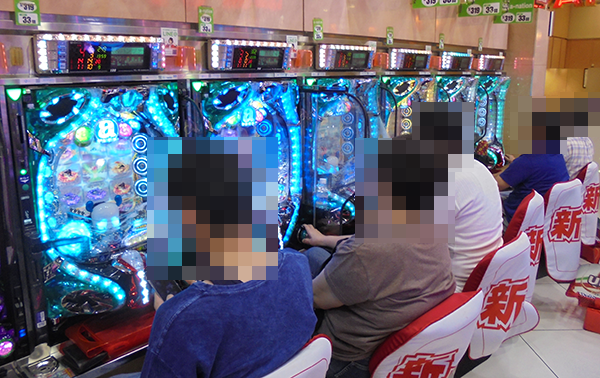16時半ごろの1000円/240玉パチンコでは、新台の「ぱちんこCR蒼天の拳天帰」や「CRフィーバーa-nation」がほぼ満席となるほどに人気。