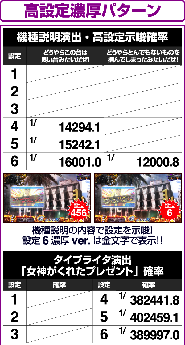 また、出現率こそ高くはないが、タイプライタ演出や機種説明演出には高設定濃厚パターンも存在する。