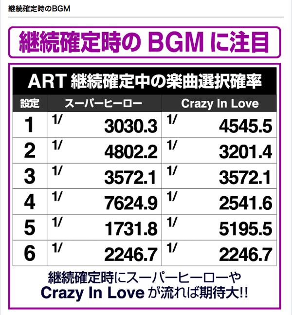 ART継続確定時のBGMは設定ごとに選択率が異なり、スーパーヒーローは設定5or6において選択されやすい。純粋に高設定ほど選択率が高くなるわけではない点も覚えておこう。