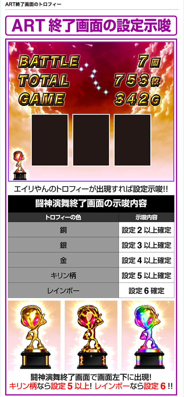 「パチスロ北斗の拳 修羅の国篇」では、ART終了画面で金やレインボーのエイリやんトロフィーが出現した場合、高設定が濃厚となる。