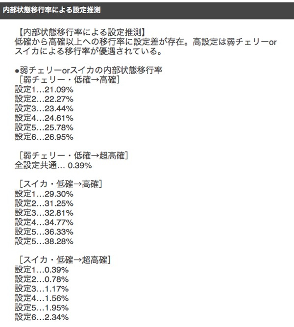 内部状態移行率に設定差が存在。高設定ほど弱チェリーやスイカ成立時に高確に移行しやすい。スイカは低確からの超高確移行率も高設定ほど優遇されている。