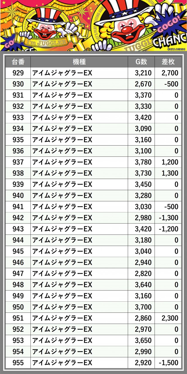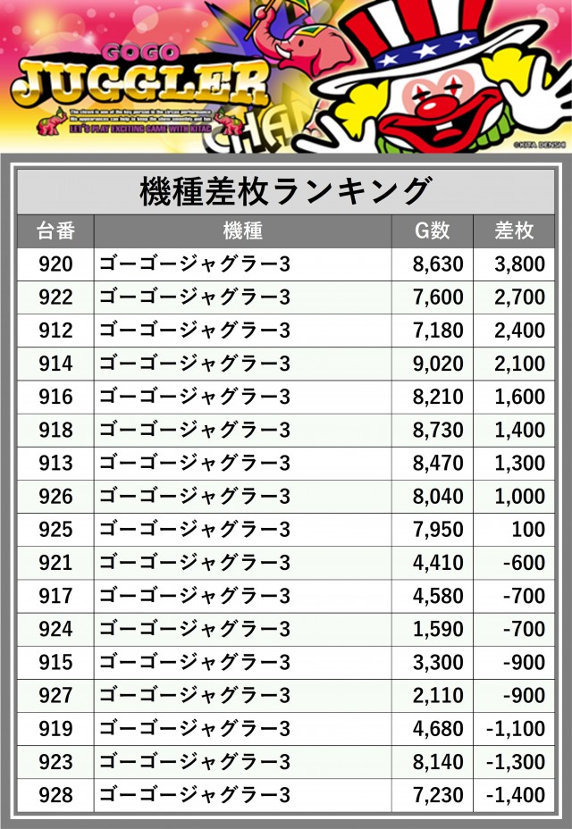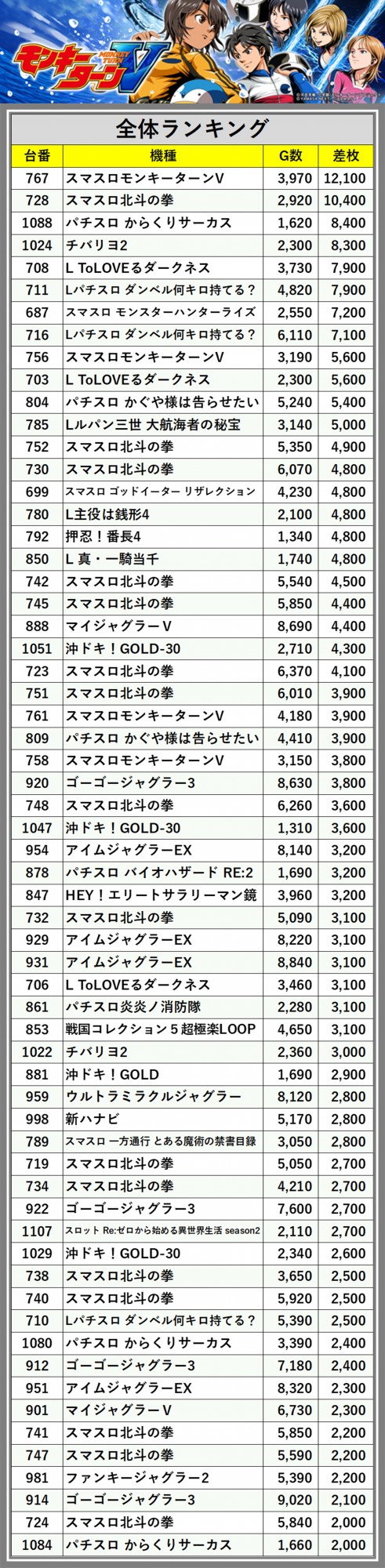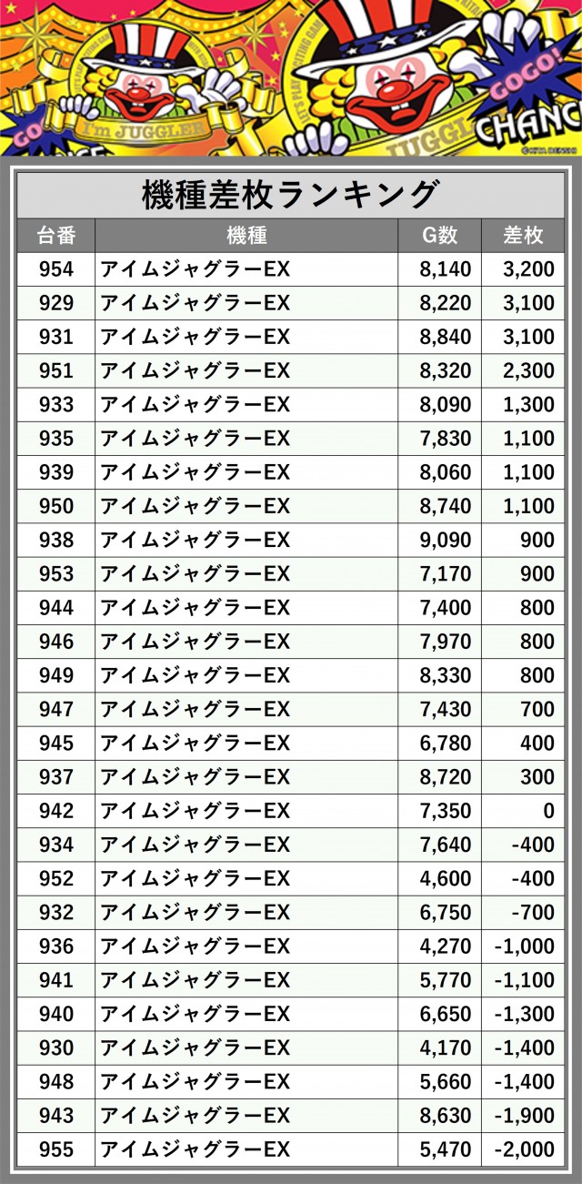 ※差枚数順に掲載しています