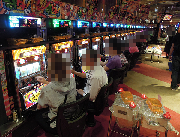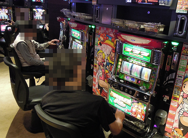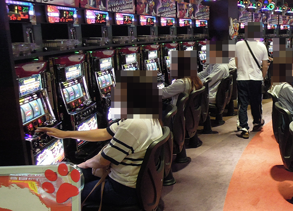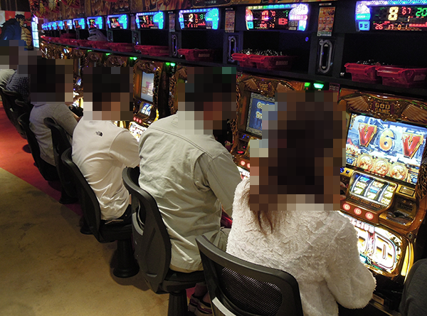 パチスロコーナーでは、AT・ART機とボーナスタイプの両方が大・大・大盛況! 華麗なパフォーマンスを披露しているプレイヤーも多く、赤丸をつける手が止まらなくなってしまった。