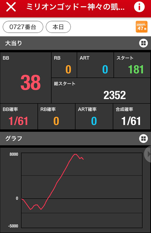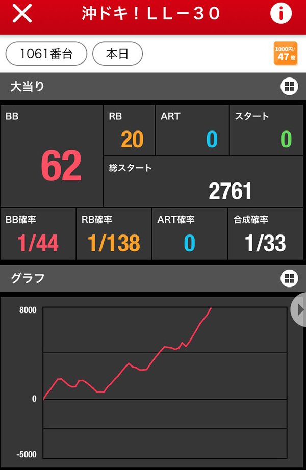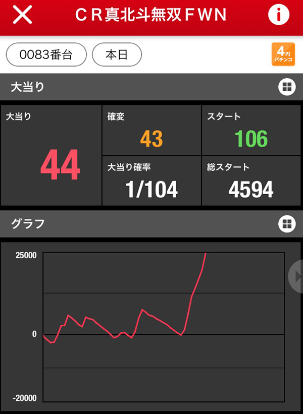 グラフからもわかるように、初当りを重ねている台や一気に上昇していく軌跡を描く台など、赤丸をつけたくなるパターンも豊富。プレイヤーたちも大満足といった表情をみせていた。