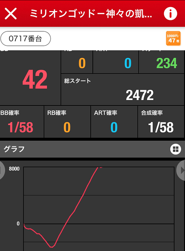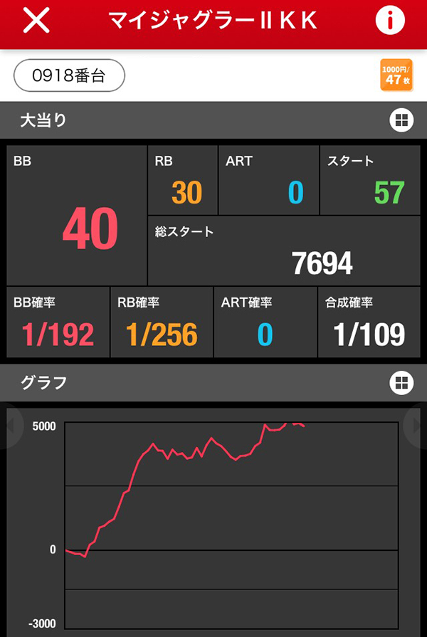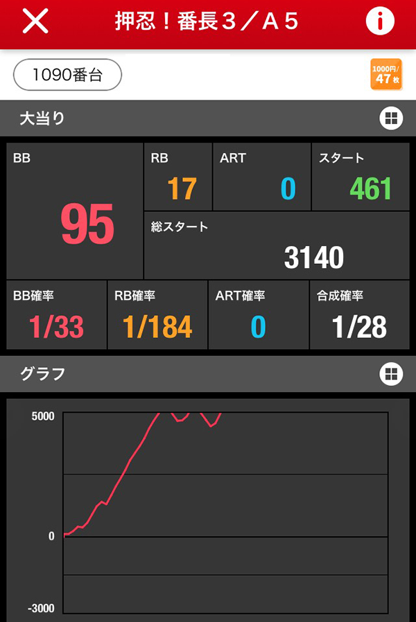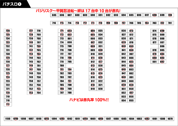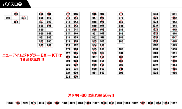 パチスロでは、20台導入の「ミリオンゴッド-神々の凱旋-」から9台、24台設置の「押忍!番長3」から6台に赤丸。