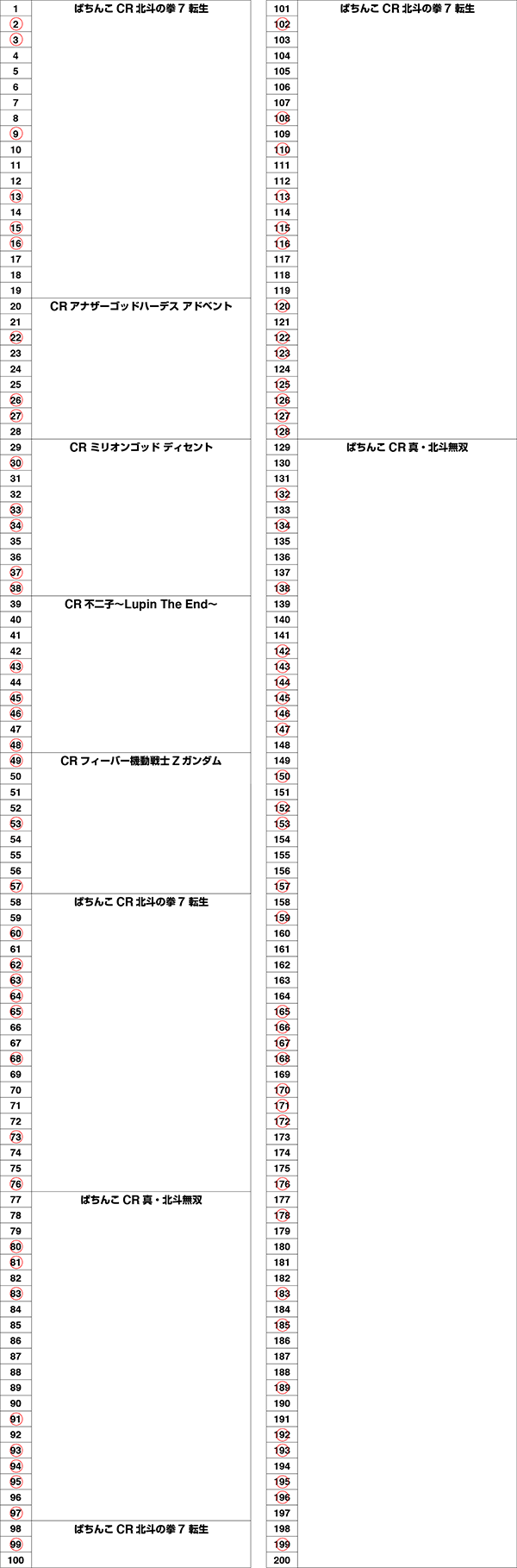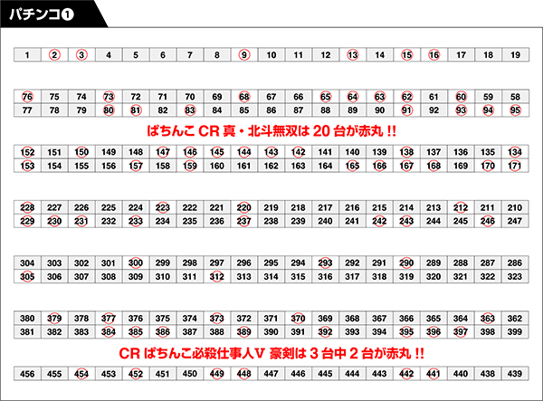 「ぱちんこCR北斗の拳7 百裂乱舞」と「CRスーパー海物語IN沖縄4」でも、赤丸をつけるにふさわしい台を確認。