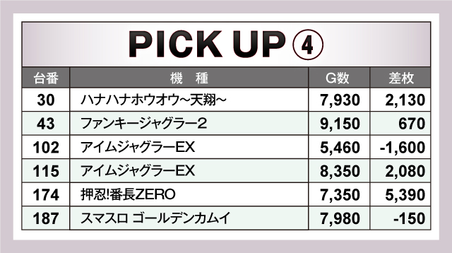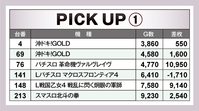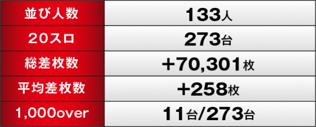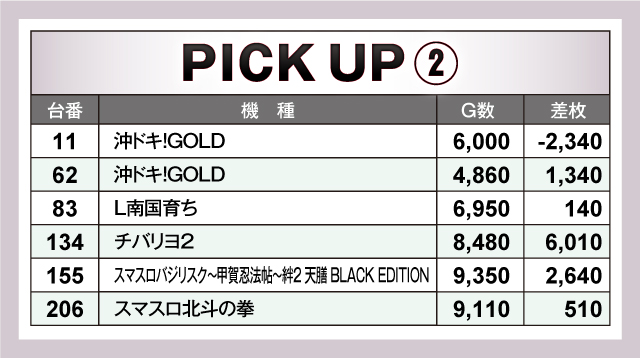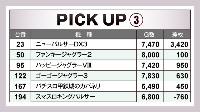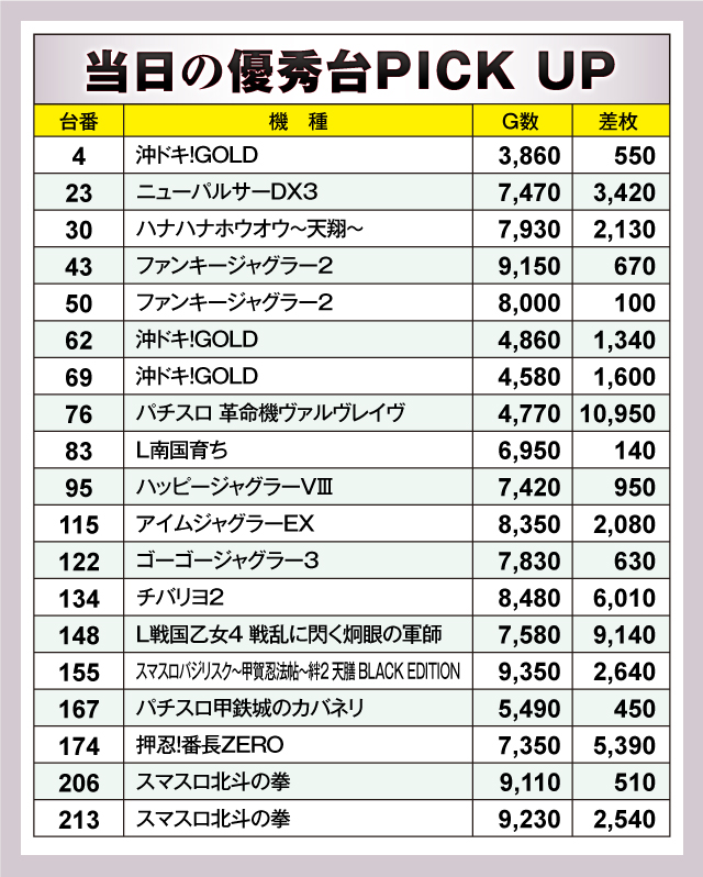 その他にも、『チバリヨ2』134番台+6,010枚や『押忍!番長ZERO』174番台+5,390枚、『ニューパルサーDX3』23番台+3,420枚を筆頭に、盛り上がった機種が多数存在。人気機種から定番機種まで、様々な機種から注目すべき台が見つかっていた。