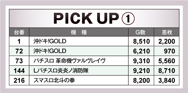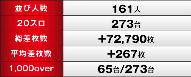 『Lパチスロ マクロスフロンティア4』138番台+12,720枚、さらに『パチスロ 革命機ヴァルヴレイヴ』225番台+10,820枚と、万枚OVERが2台出現! そのポテンシャルを存分に発揮していた。また、『Lパチスロ炎炎ノ消防隊』144番台+8,710枚とあと一歩で万枚という台も確認でき、ホール内が熱気に渦巻いていたことがわかる。G数も9,000G以上に達する台も多く、遊技していたファンは充実した時間を過ごせていたに違いない。