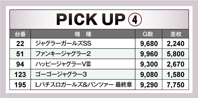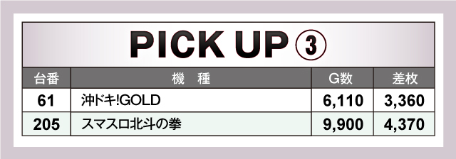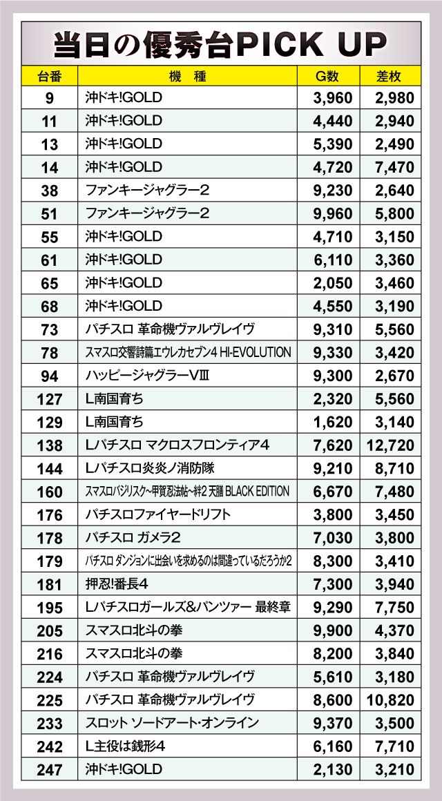 その他にも上表に記載しているとおり、膨大な熱量を放っていた台が多数存在。特にジャグラーシリーズや沖スロといった定番機種の活躍が際立って見える。どの機種にもチャンスが眠っていたのは、同ホールの実力の高さを示していると言っていいだろう。