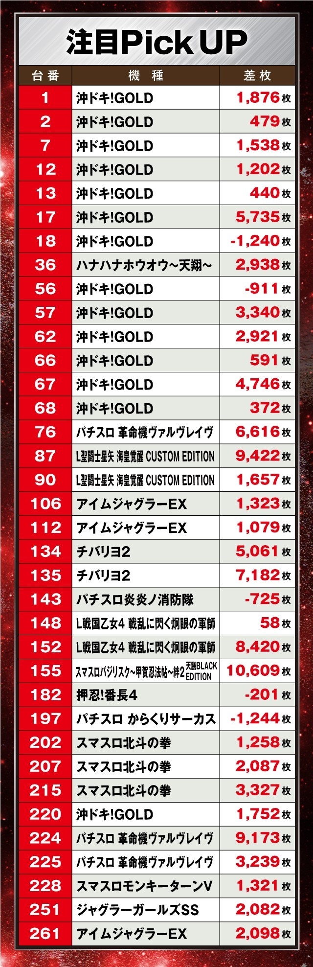 また、その他の機種を見てみると『スマスロバジリスク~甲賀忍法帖~絆2 天膳 BLACK EDITION』の万枚超を筆頭に『L聖闘士星矢 海皇覚醒 CUSTOM EDITION』で+9,422枚、『パチスロ 革命機ヴァルヴレイヴ』で+9,173枚、『L戦国乙女4 戦乱に閃く炯眼の軍師』で+8,420枚と、万枚目前の台が続出していただけにファンも大満足の一日だったに違いない。