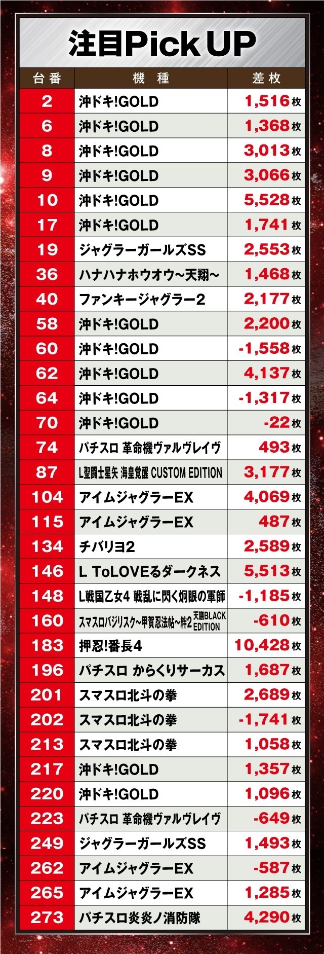 なかでも『沖ドキ!GOLD』が活況で、10番台の+5,528枚を筆頭に+4,000枚超が1台、+3,000枚超が2台と、その性能をフルに発揮していた。しかも、対象となった13台中10台がプラスで終了するという、ファンにとっては大満足の一日になったと言えるだろう。