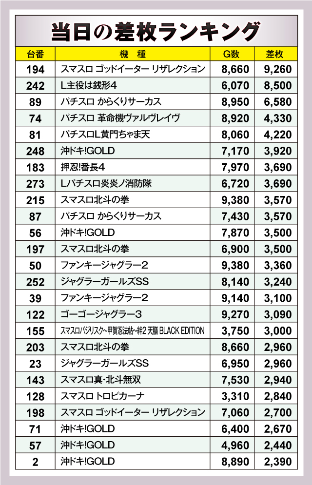 優秀台を見てみると、+9,260枚を記録した『スマスロ ゴッドイーター リザレクション』の194番台がトップに。もう少しで万枚に届こうかという素晴らしい成果をあげた。それに続いたのが+8,500枚の『L主役は銭形4』242番台。十分、主役級の活躍を見せたといえよう。さらに+6,580枚で『パチスロ からくりサーカス』89番台が続いた。以下、+4,330枚の『パチスロ 革命機ヴァルヴレイヴ』74番台、+4,220枚の『パチスロL黄門ちゃま 天』81番台、+3,920枚の『沖ドキ!GOLD』248番台、+3,590枚の『押忍!番長4』183番台などが盛り上がりを見せていた。