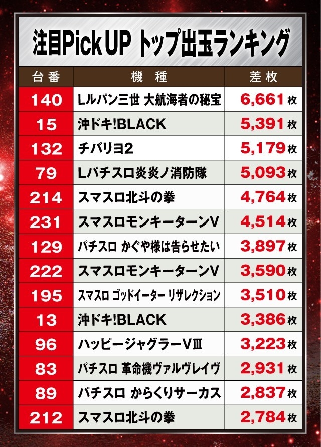 また、その他の機種を見てみると『沖ドキ!BLACK』と『チバリヨ2』で+5,000枚超、『ハッピージャグラーVⅢ』で+3,000枚超など、沖スロやAタイプも好成績を残し上位にランクインしている。