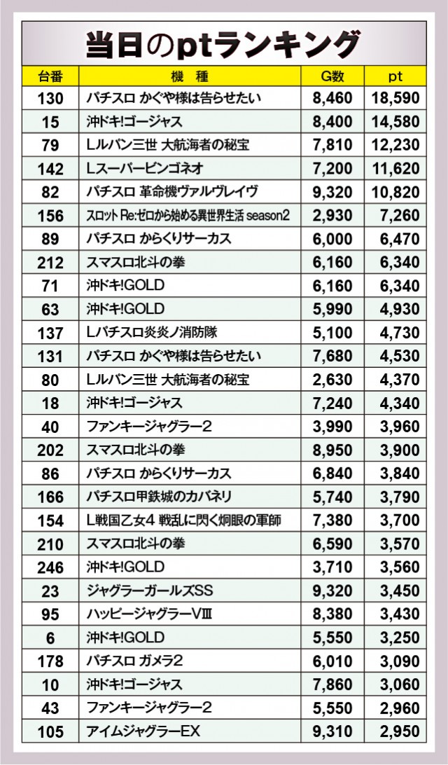 『パチスロ かぐや様は告らせたい』『沖ドキ!ゴージャス』『Lルパン三世 大航海者の秘宝』『Lスーパービンゴネオ』『パチスロ 革命機ヴァルヴレイヴ』の5台から万枚OVERが放たれ、当日の店内の盛り上がりを牽引。いずれも朝から閉店までじっくりと打ち込まれていたことから、相当な手応えを感じていたのは間違いない。そして沖スロ機やノーマル機など、幅広い機種が名を連ねている点も好印象で、館内全体が沸いていたと想像に容易い。