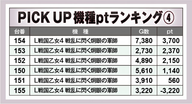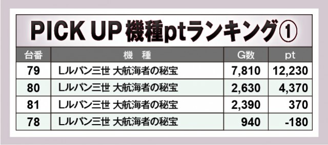 万枚OVERを達成した『Lルパン三世 大航海者の秘宝』『沖ドキ!ゴージャス』はもちろん、『パチスロ からくりサーカス』『L戦国乙女4 戦乱に閃く炯眼の軍師』も活気と熱気に満ちており、優秀機種が中心となって盛り上がりを作っていた様子が窺える。8~9,000回転という大きな数字は、ファンの手応えを感じると同時に、満足度の高さも見て取れるばかり。有意義な時間を過ごしていたのは間違いなく、同店の実力を実感する内容だ。