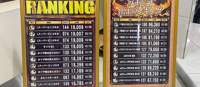 『スマスロ シャーマンキング』にて9,660枚という熱気が放たれ、万枚到達目前という勢いを披露していた。さらに『チバリヨ2』『L 東京喰種』が7,000枚OVER、『Lスーパービンゴネオ』も7,000枚OVERで追随しており、ファンは館内の熱量に歓喜していたことだろう。また『ウルトラミラクルジャグラー』では万回転OVERが発生しており、各所で朝から閉店まで打ち込まれた様子も見逃せないポイントだ。