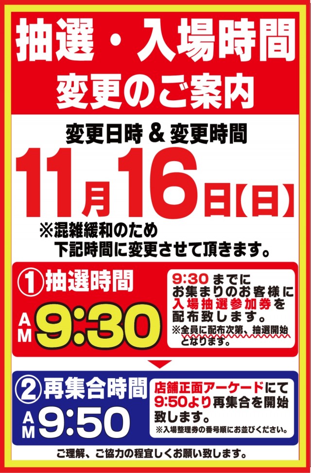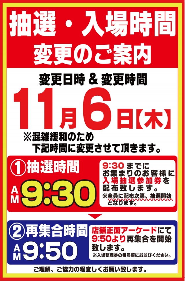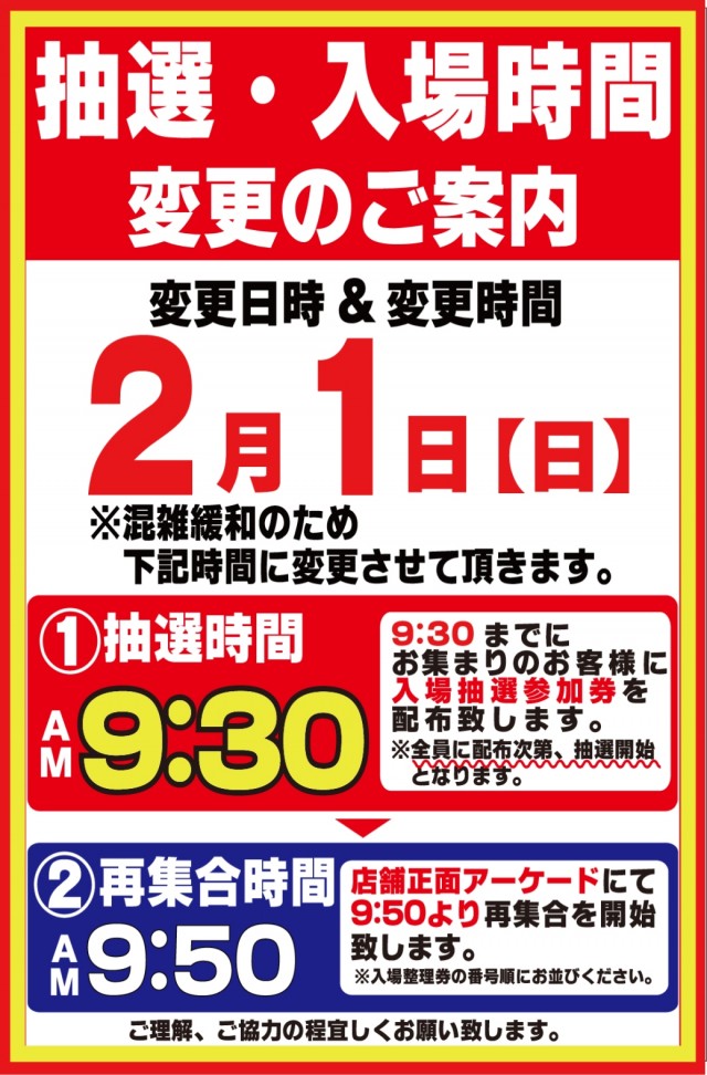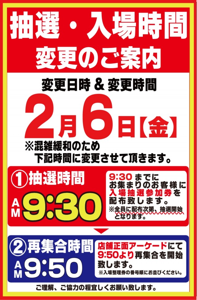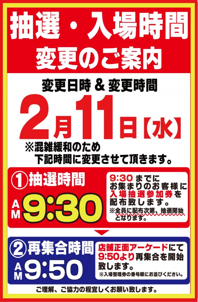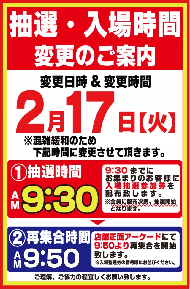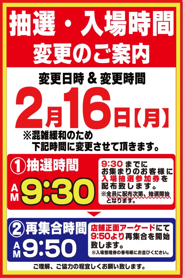 入場整理券は抽選方式 9時40分より入場抽選を行っております。※混雑が予想される日程によっては抽選時間の変動がございます。変更時にはPUSH通知にてご案内いたします。 |