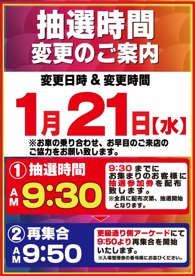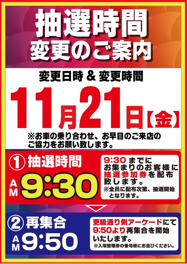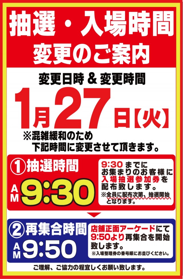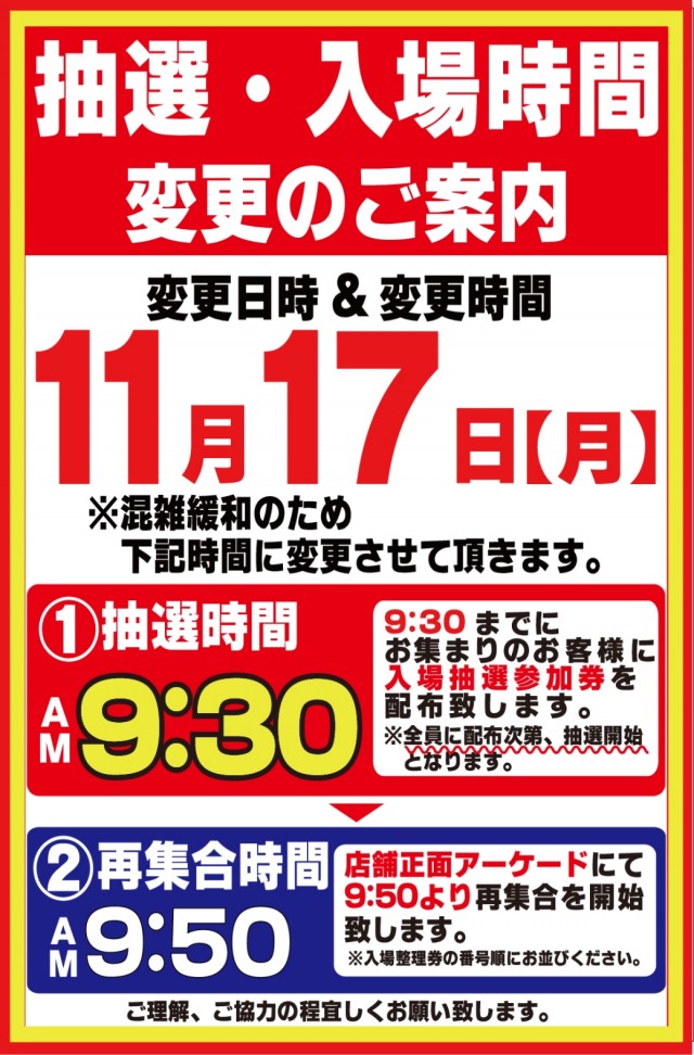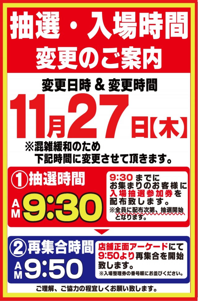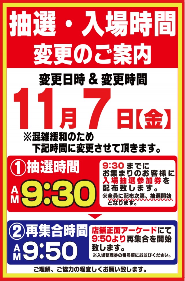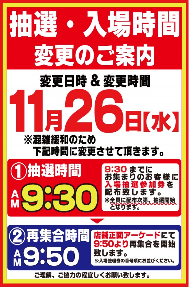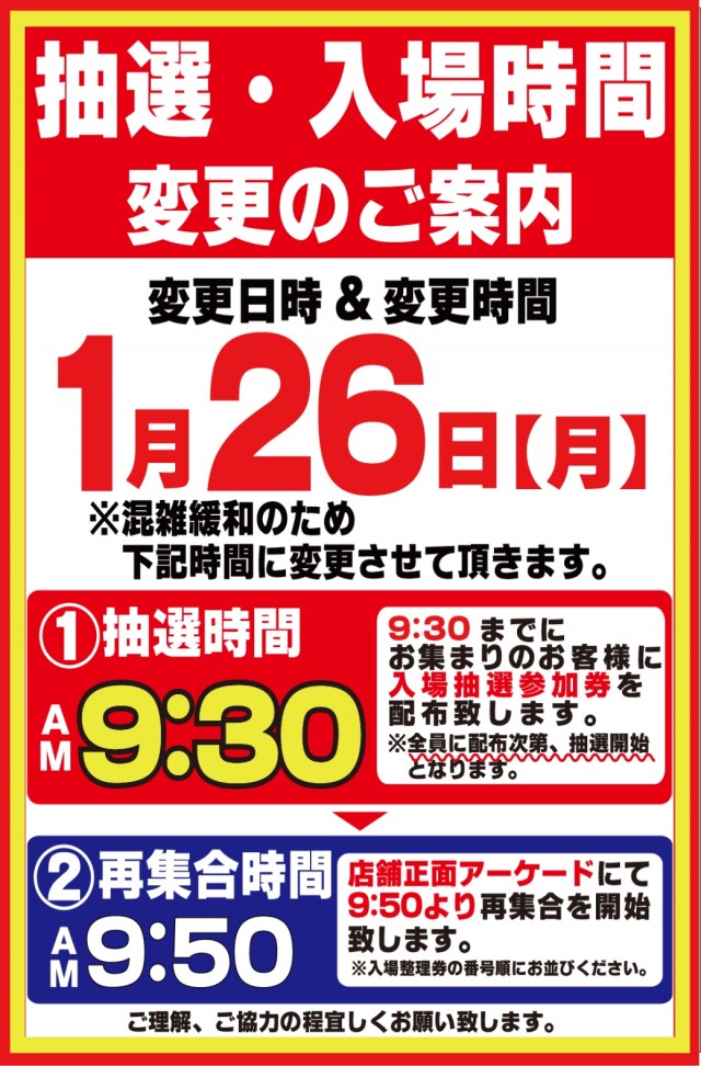 入場整理券は抽選方式 9時40分より入場抽選を行っております。※混雑が予想される日程によっては抽選時間の変動がございます。変更時にはPUSH通知にてご案内いたします。 |