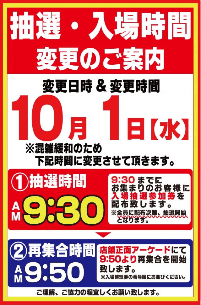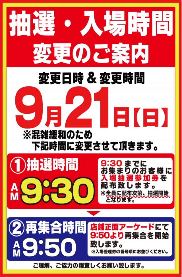 入場整理券は抽選方式 9時40分より入場抽選を行っております。※混雑が予想される日程によっては抽選時間の変動がございます。変更時にはPUSH通知にてご案内いたします。 |