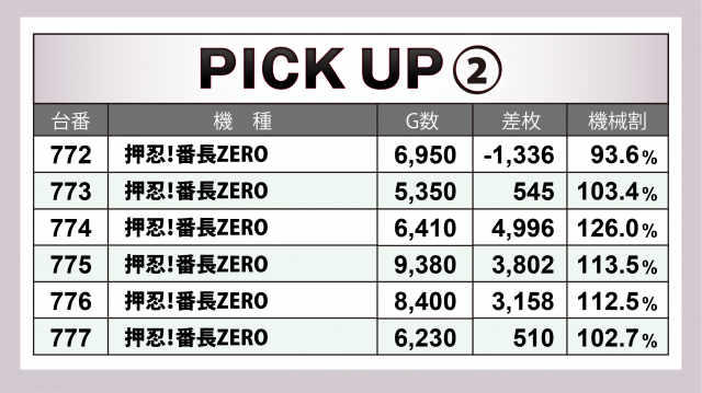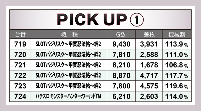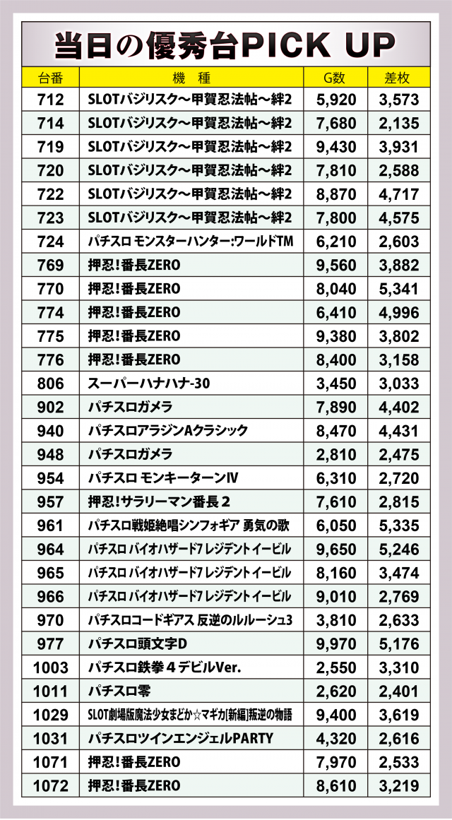 また当日は2か所の横並び好況スポットが出現。『SLOTバジリスク~甲賀忍法帖~絆2』『パチスロ モンスターハンター:ワールドTM』は計6台が全てプラス&トータルで+2万枚突破、『押忍!番長ZERO』はマイナスが1台あったものの6台トータルで+1万1千枚オーバーを達成! また、横並びの対象以外の同機種でもハイスコアを残していた。