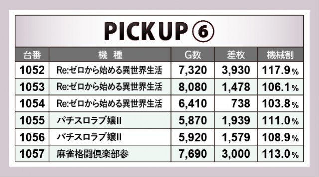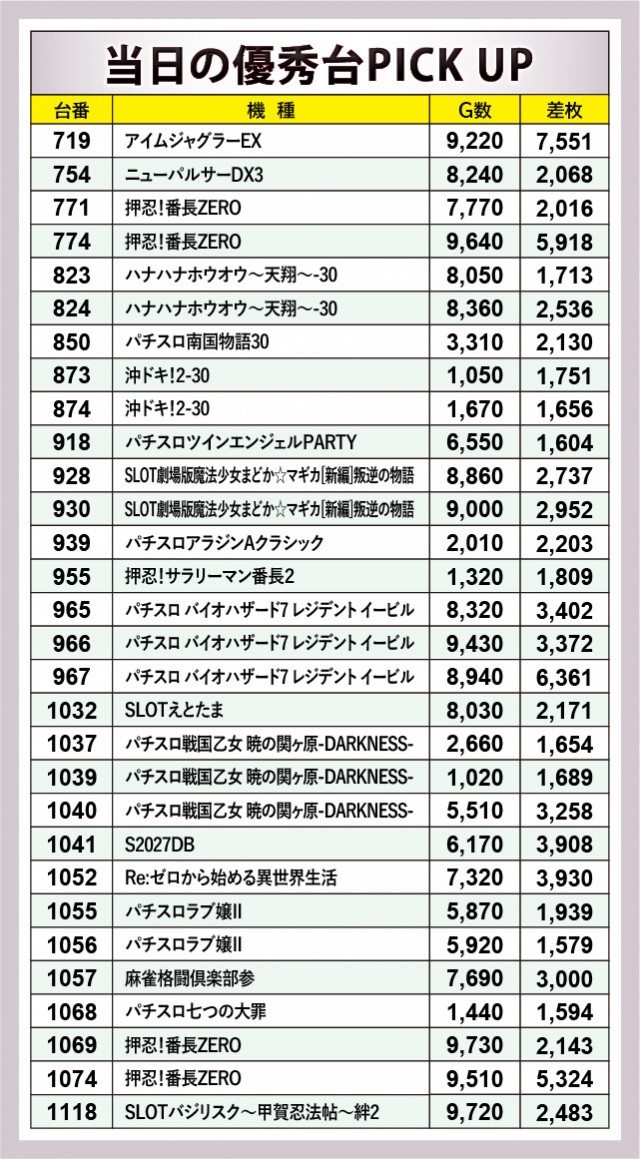 優秀台をチェックすると、ノーマル機やAT機、沖スロなど、多種多様な機種が名を連ねている。とりわけAT機の活躍が目立っており、3千枚OVERという熱気を放っていた台が多かったのが印象的だ。どの機種にもチャンスがあり、遊技していたファンは有意義な時間を過ごせたことだろう。