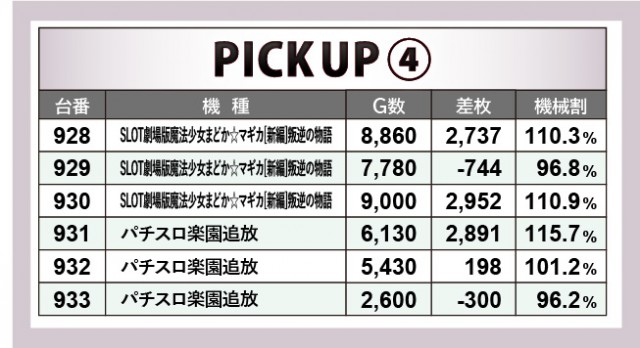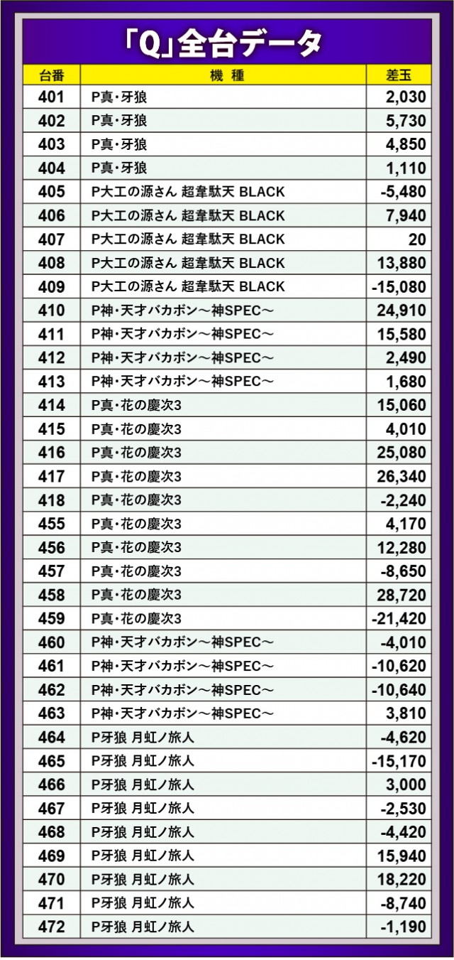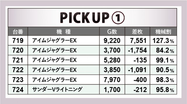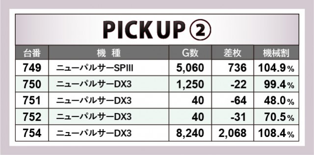 まずノーマル機からは、『アイムジャグラーEX』719番台+7,551枚という圧巻の記録に目を奪われてしまう。同機種では横並びスポットを確認できたが、全台プラスとならなかったのが残念だ。対して『ニューパルサーDX3』では754番台+2,068枚の記録が発生。全体的に回転数が少ないものの、ポテンシャルを感じられた一角である。