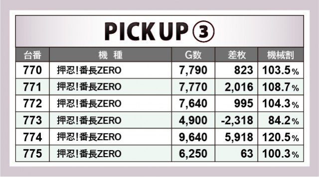 そして人気機種『押忍!番長ZERO』は774番台にて+5,918枚という大台を突破する台が見られた。そのほかの台も追随するように熱気を放っており、横並び一閃で盛り上がっている様子は、どのファンの目からも可能性を感じられたのではないだろうか。より粘り強く戦うことで、また結果が大きく変わったかもしれない島の1つだろう。