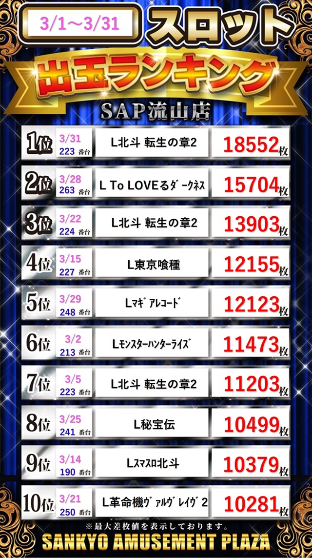 明日はFirstSaturday!!出玉ランキングも更新!!