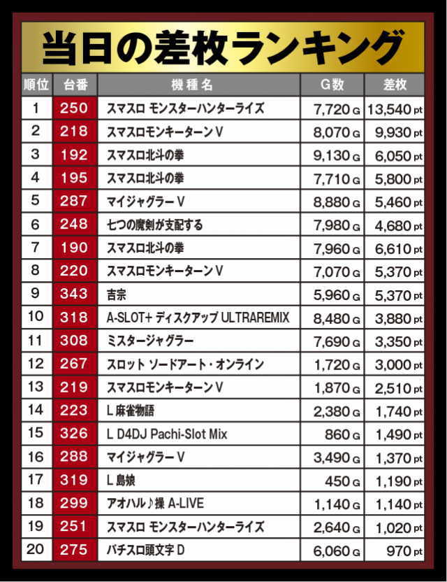 この日のSAPグループはひと味違う。DMMぱちタウンは、「SAP流山」の特別なひとときを一斉取材した。特に華々しい活躍を残した機種たちをピックアップして紹介しよう。まずは差枚ランキングの発表だ!