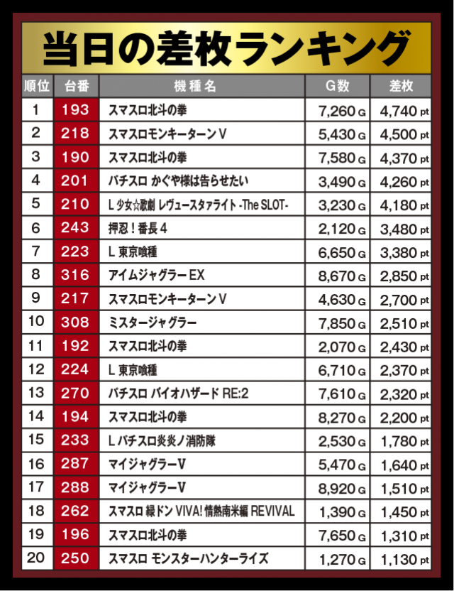 この日のSAPグループはひと味違う。DMMぱちタウンは、「SAP流山」の特別なひとときを一斉取材した。特に華々しい活躍を残した機種たちをピックアップして紹介しよう。まずは差枚ランキングの発表だ!