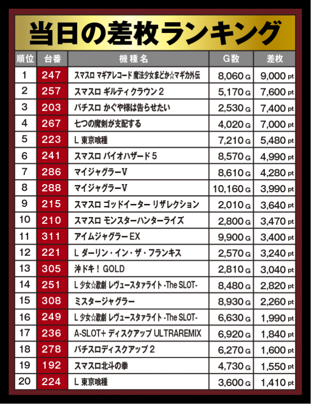 この日のSAPグループはひと味違う。DMMぱちタウンは、「SAP流山」の特別なひとときを一斉取材した。特に華々しい活躍を残した機種たちをピックアップして紹介しよう。まずは差枚ランキングの発表だ!