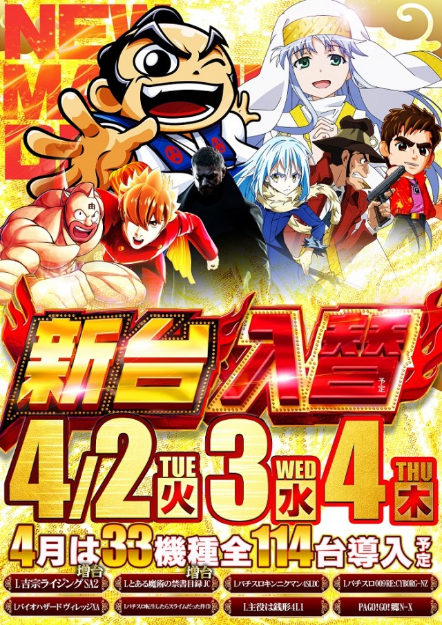 4月2日新台入替10時開店!4月は33機種114台導入予定!