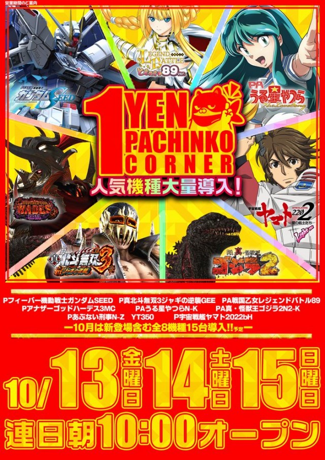 15日(日) 10時開店!10月は全19機種84台導入予定!