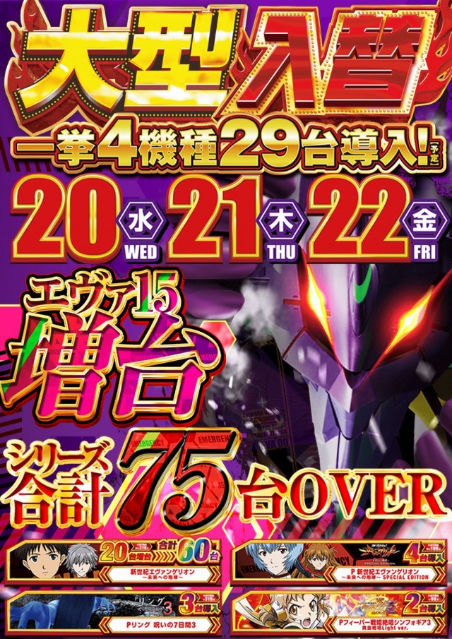 9月22日(金) 大型新台入替3日目!エヴァ15増台完了!