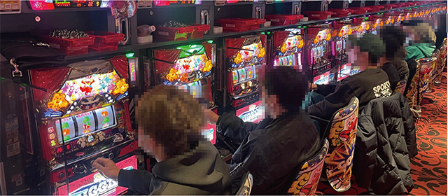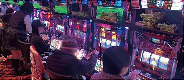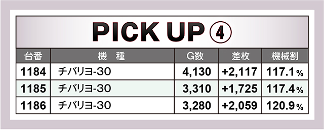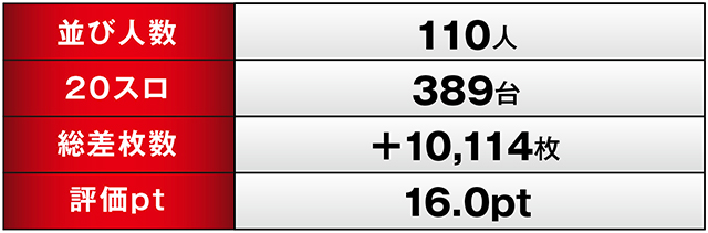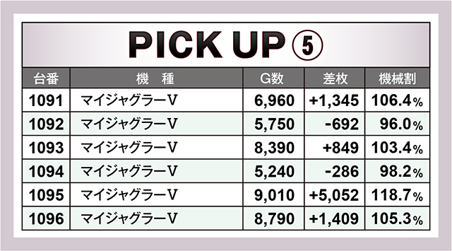 特筆すべきは12台並び(!)で好成績を連発していた『SLOTバジリスク~甲賀忍法帖~絆2』だろう。その勝率は80%を超えていただけでなく、3,000枚オーバー記録が4台も。さらには『マイジャグラーⅤ』も6台並びで優秀台特有の挙動を示していた。