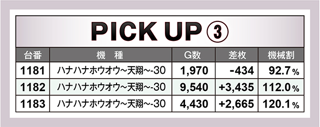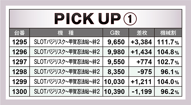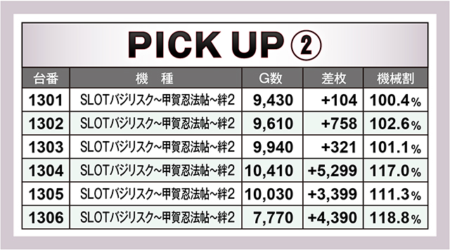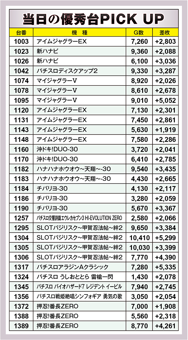 Aタイプや沖スロなどから+2,000枚以上の記録が続出。Aタイプと沖スロは常連プレイヤーに特に支持されている機種のため、そこに優秀台を多く配置したのかもしれない。もちろんAT・ART機にも抜かりはなく、『SLOTバジリスク~甲賀忍法帖~絆2』『押忍!番長ZERO』などの超主力マシンからも好記録が多数生まれていたのを取材班は見逃さなかった!