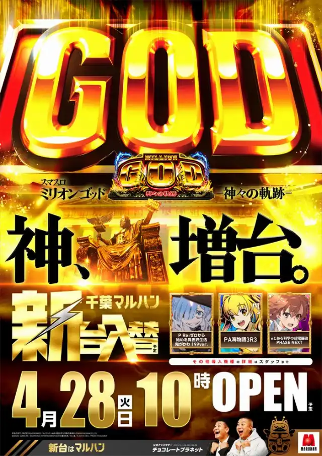 ゴッド最速増台!新台入替初日4月28日(火) 朝10時OP!