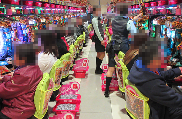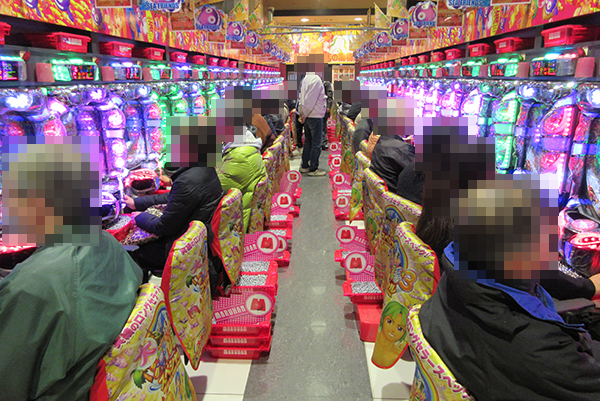 16時を過ぎた頃の4円パチンコでは、「CR大海物語3スペシャル」をはじめとする海物語シリーズが活気づいており、空き台も少ない。