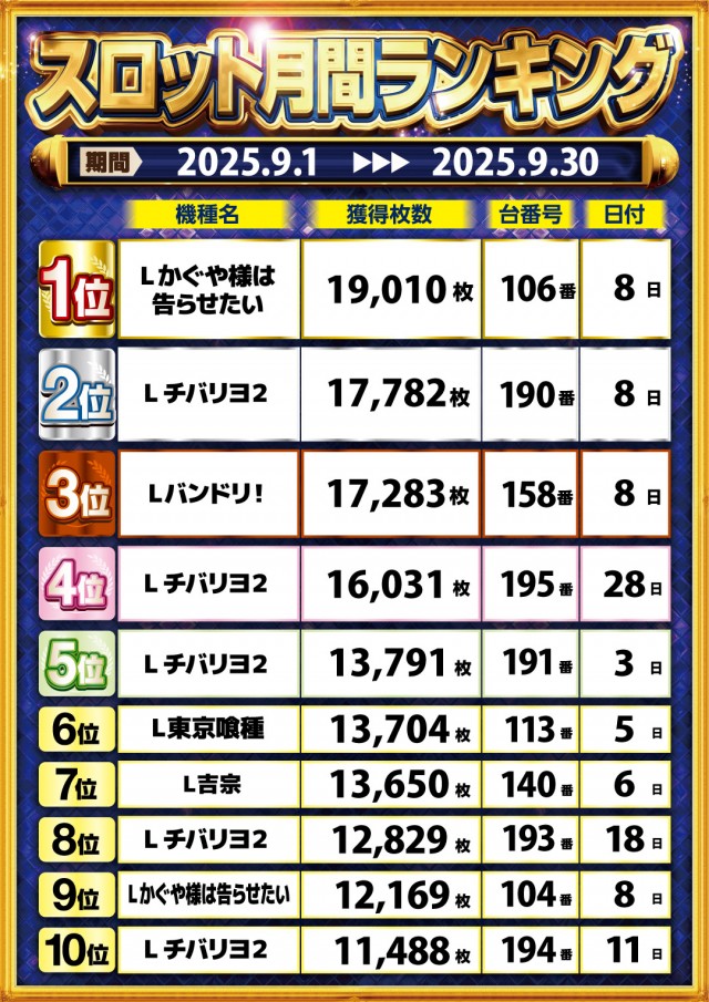 1位 10月7日(火) 2位 10月5日(日) 3位 10月6日(月)
