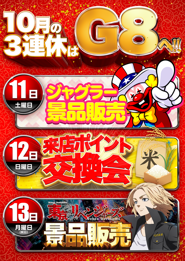 3連休盛りだくさん❗ぜひG8店へ👍👍ご来店お待ちしてます😊