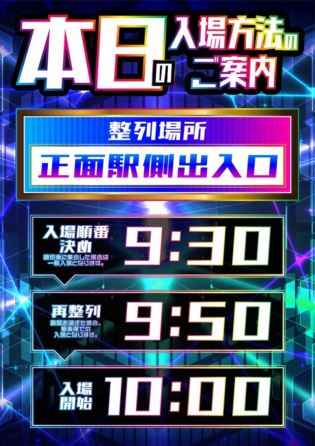 9:30迄に駅側入口へお並び頂いた方へ、入場整理券の抽選を行っております。※時間変動がある日は店内、HP、SNSにてお知らせいたします。 |